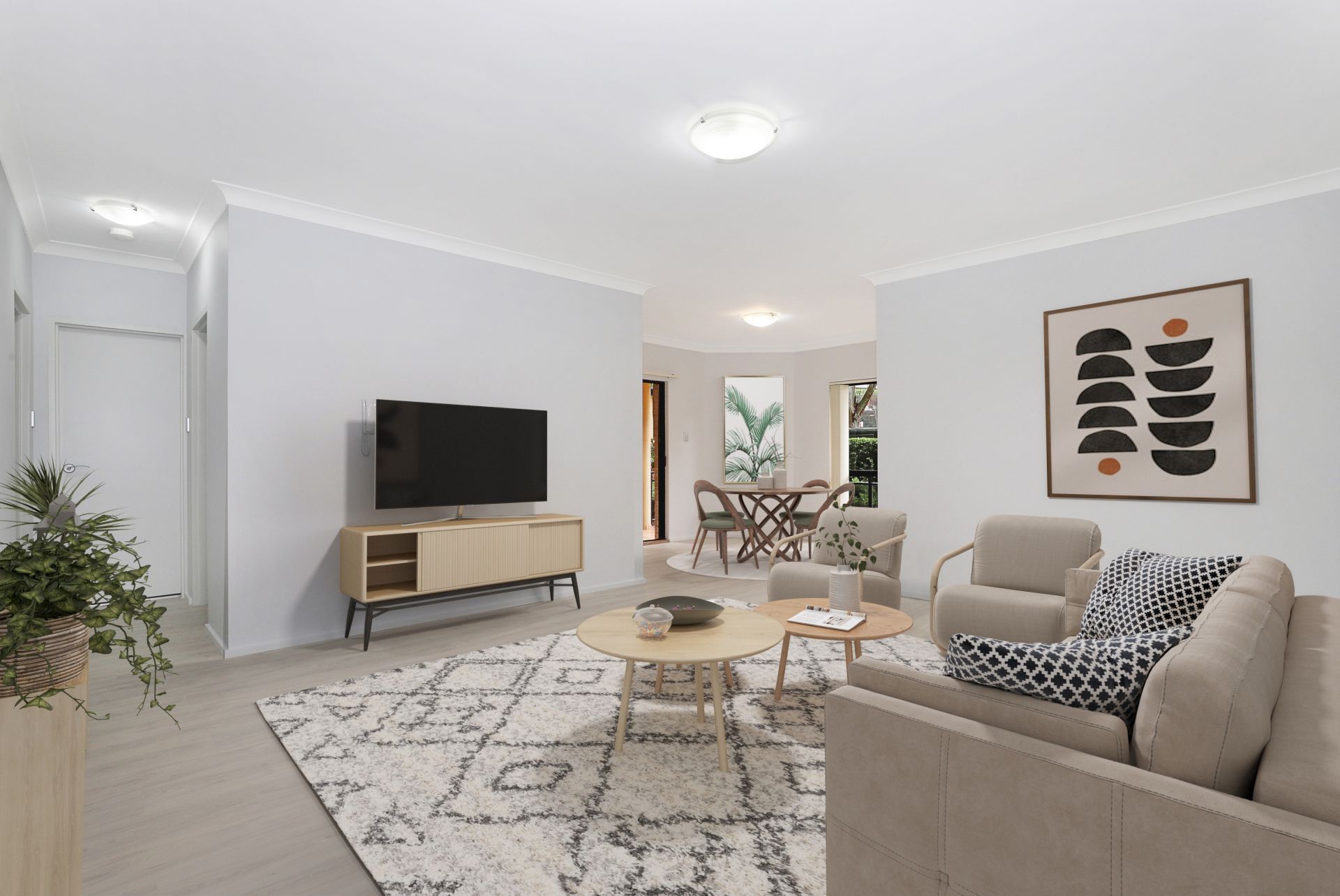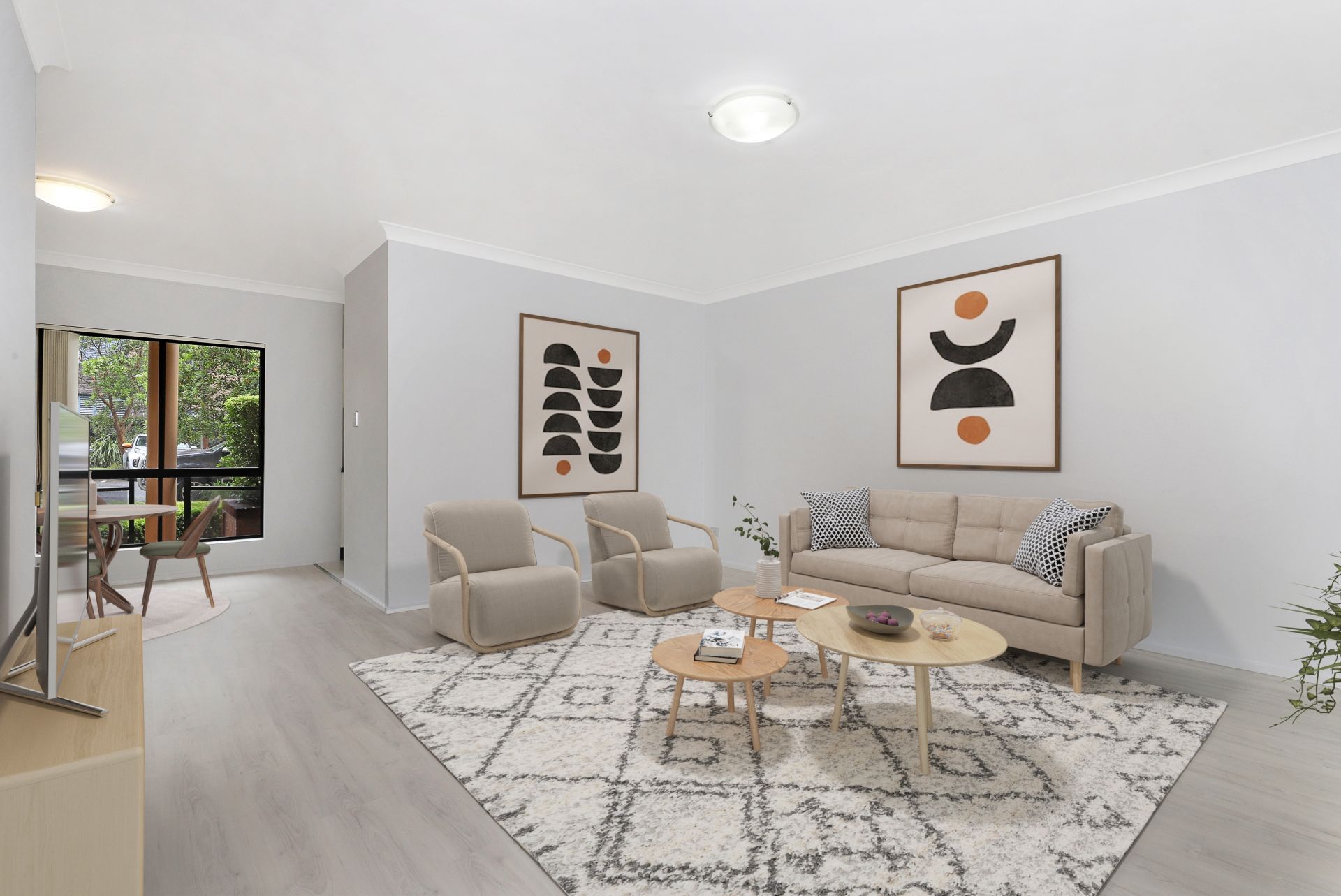 - Large living and dining area with newly laid flooring