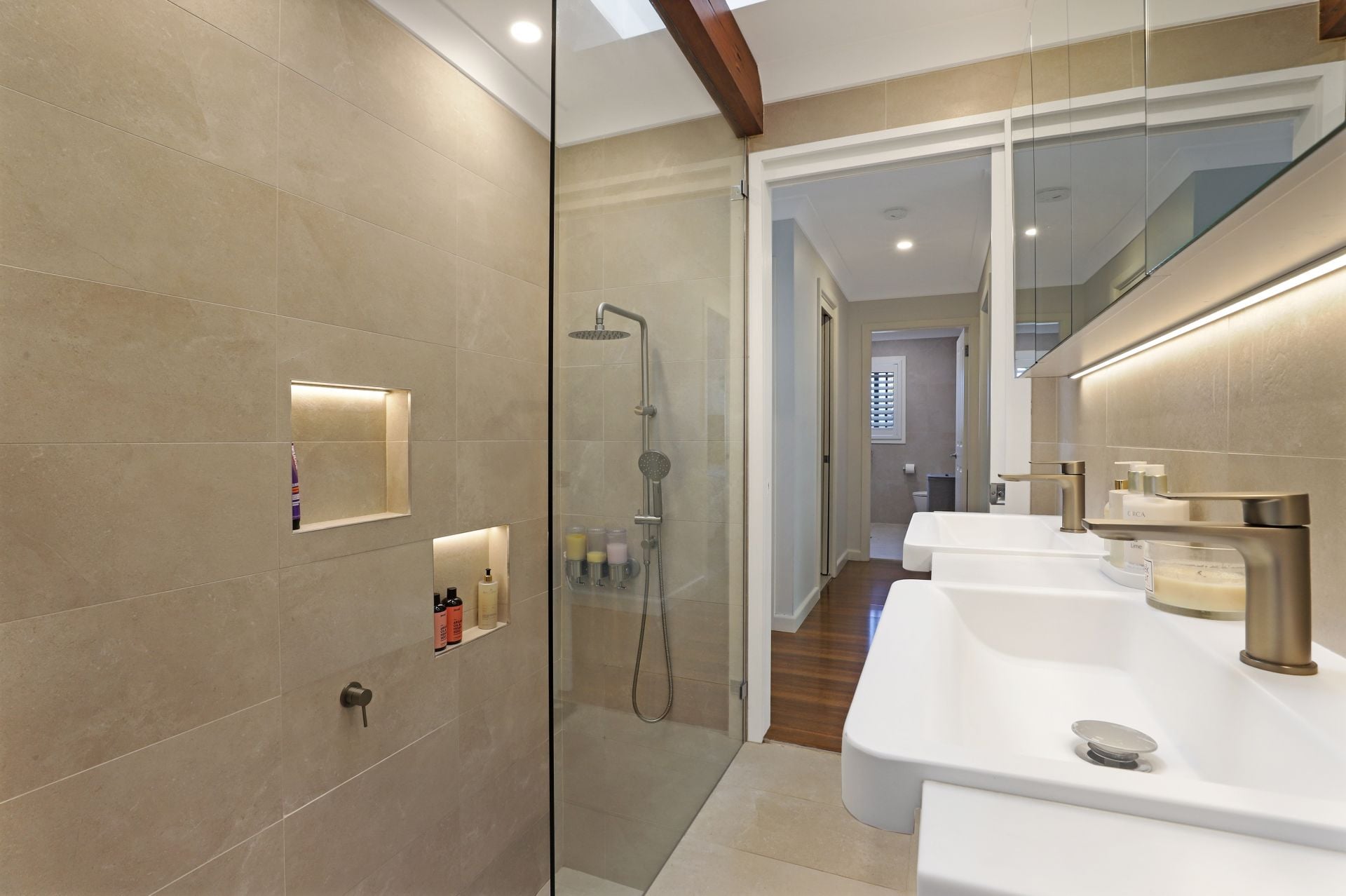 - Main bathroom with his and hers sink, mirrored storage and separate toilet