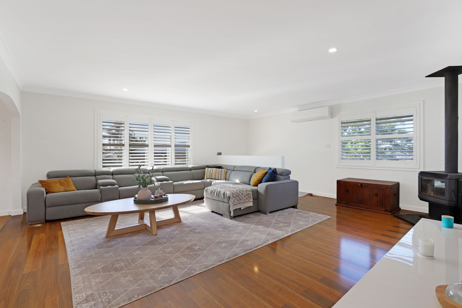 - Oversized living area with fireplace, air conditioning and timber flooring