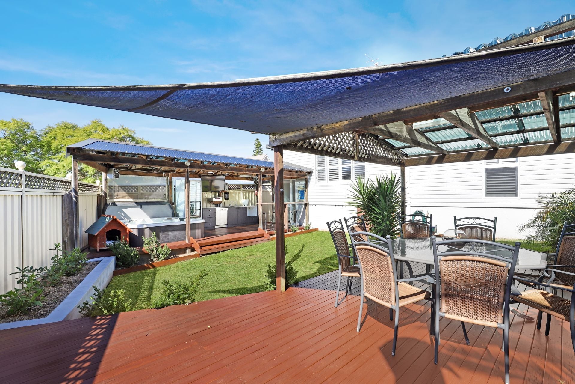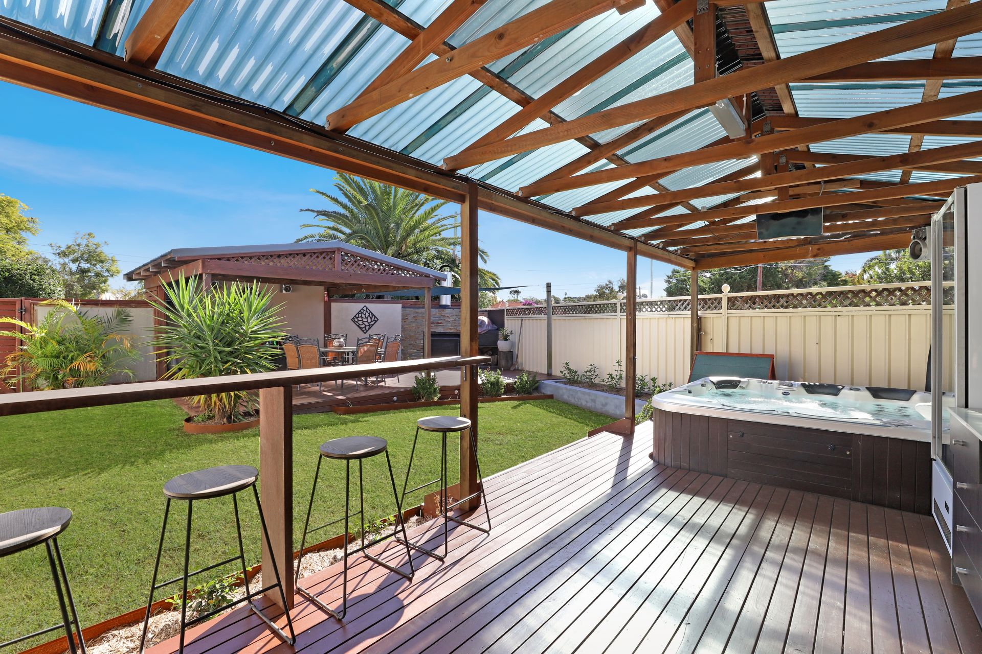 - Large covered back deck with built-in spa, dual sink and leveled grassed yard
