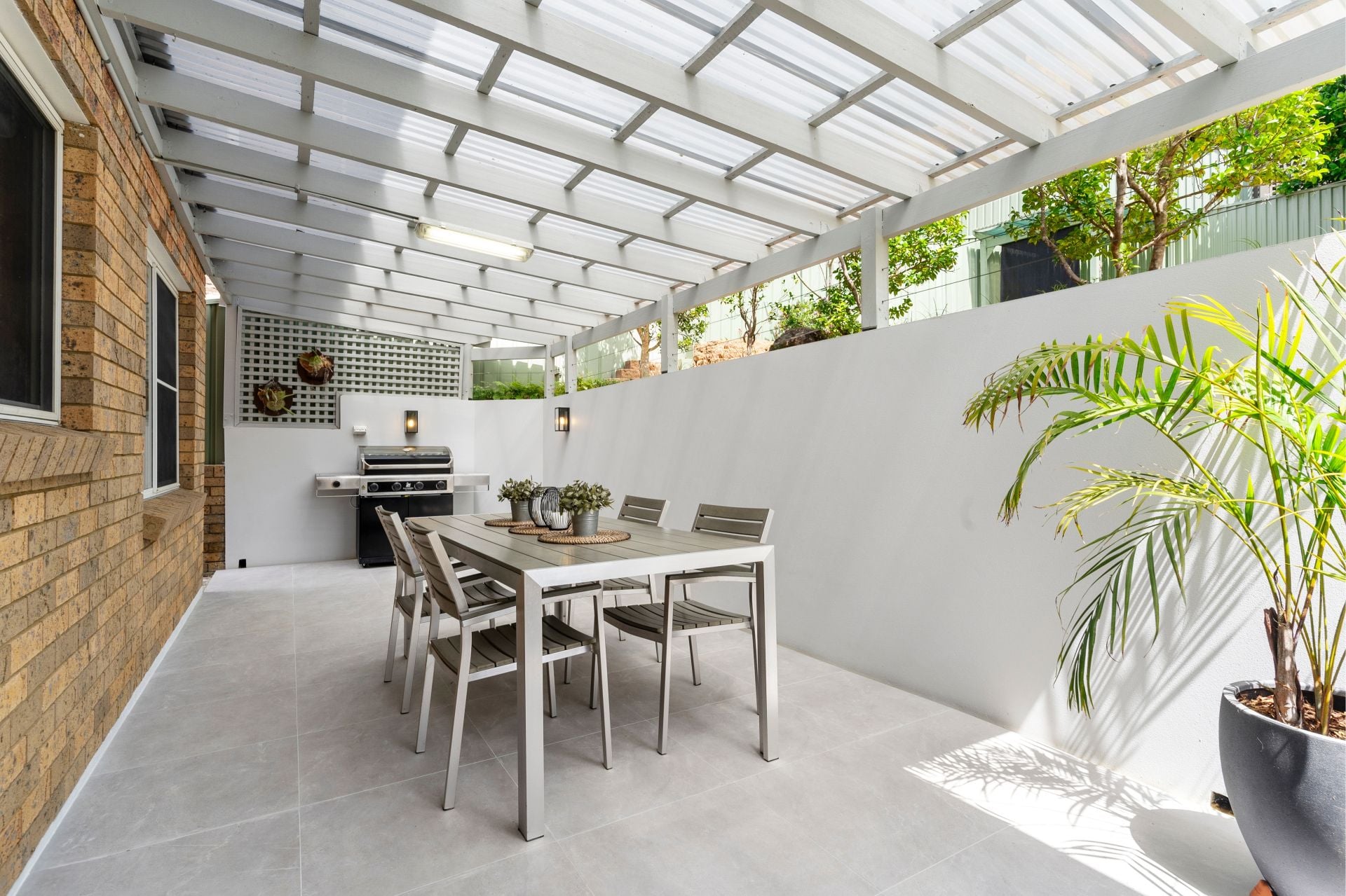- Entertainers size covered alfresco area, established gardens and grassed area