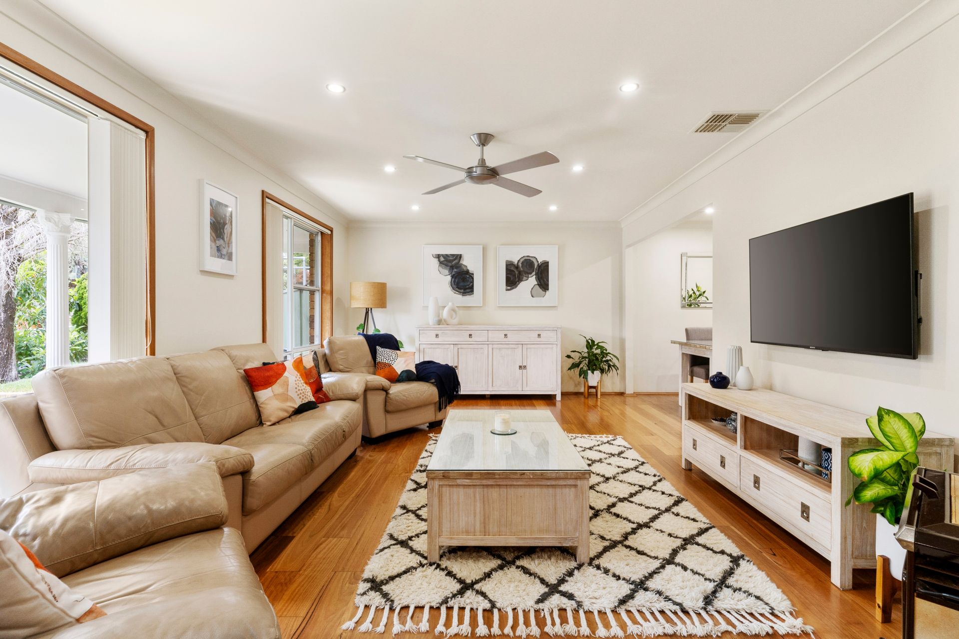 - Bright and open living area with combustion fireplace and hardwood flooring throughout