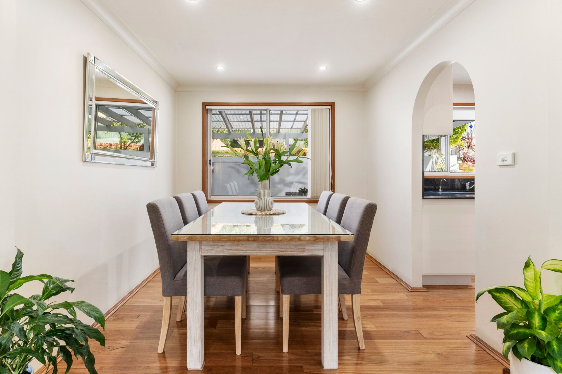 - Stylishly appointed kitchen with stone bench tops and adjacent formal dining area