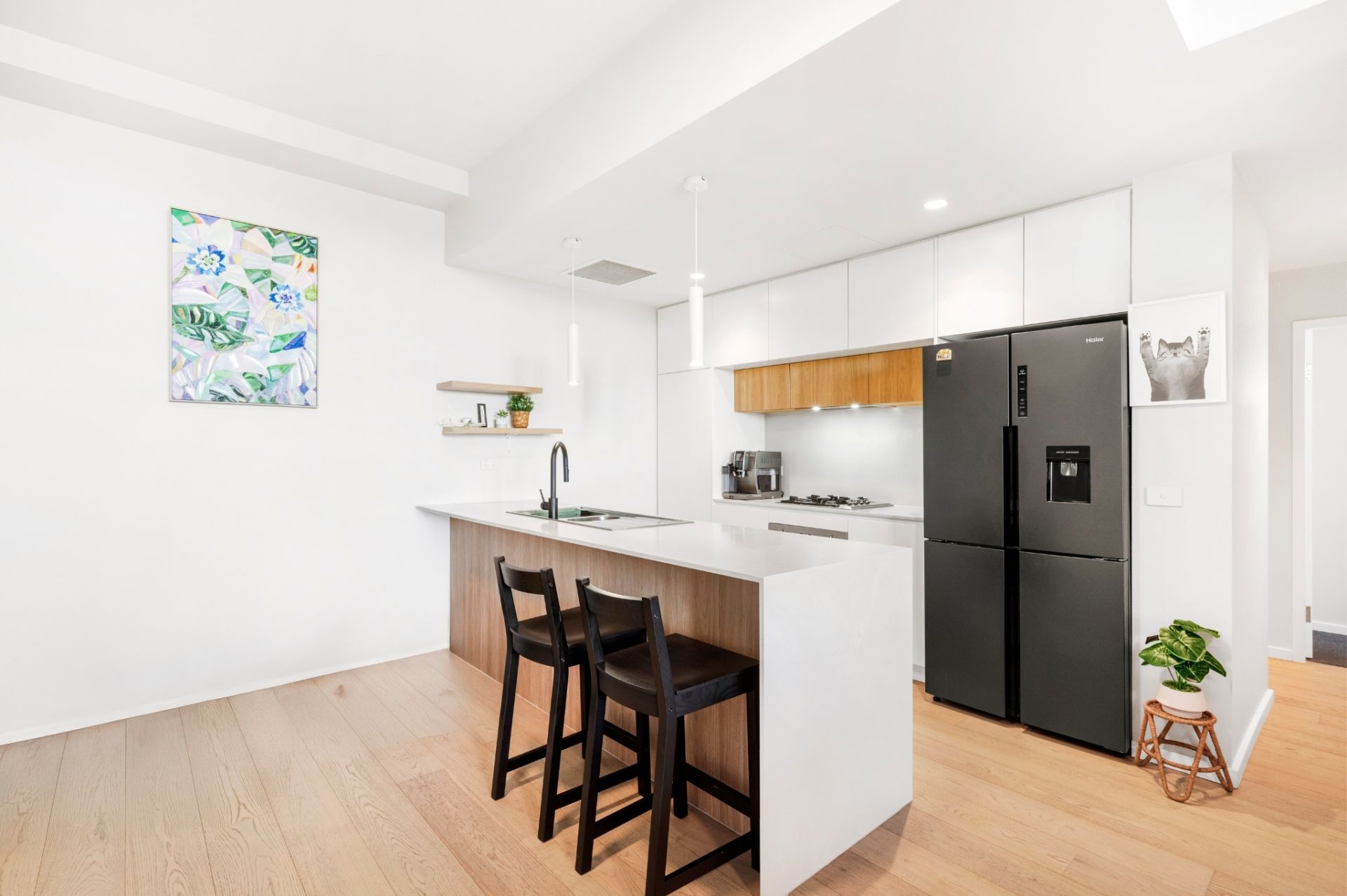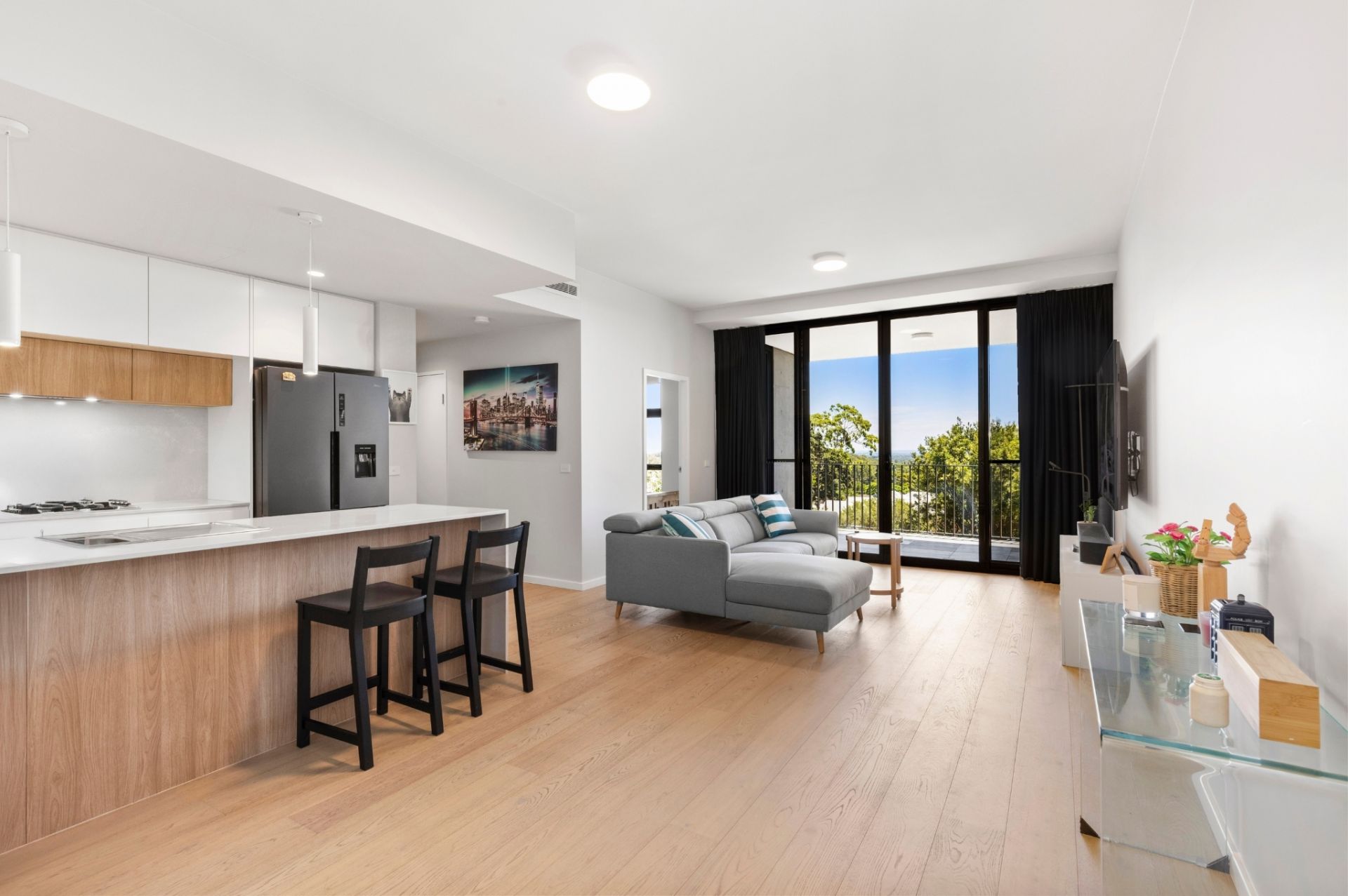 - Open-plan living and dining areas have timber-look flooring throughout
