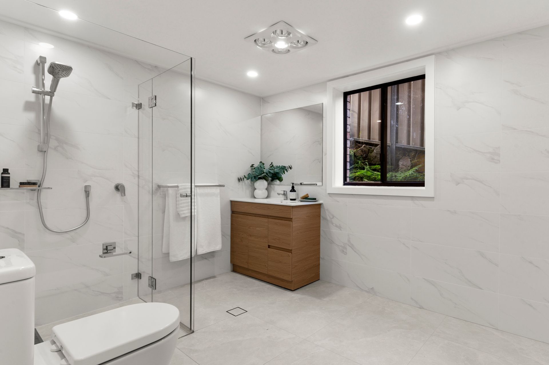 - Main bathroom with dual access from the main bedroom and a separate toilet